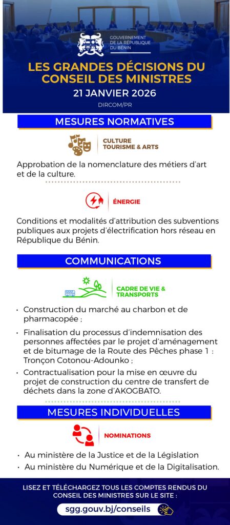 Le gouvernement béninois s’est retrouvé en séance ce mercredi 21 janvier 2026, sous la conduite du chef de l’État, Patrice Talon. Cette première réunion officielle de l’année a permis d’examiner divers dossiers et d’entériner plusieurs mesures destinées à orienter l’action publique. découvrez le point à travers cette infographie réalisée par la cellule de communication du gouvernement.