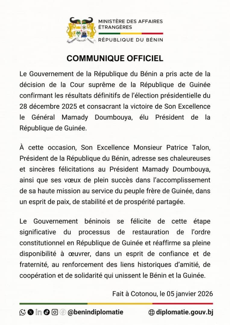 Le Président de la République du Bénin, Patrice Talon, a adressé ses chaleureuses et sincères félicitations à son homologue guinéen, Mamady Doumbouya, à la suite...